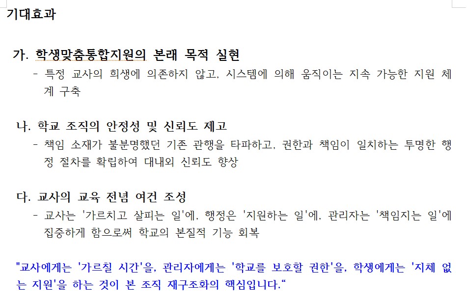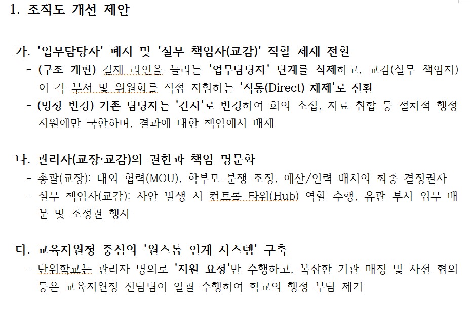 처리할 권한이 부재한 상태에서 실무만을 떠맡으라 → 업무 처리자 개개인의 고통과 책임으로 치환되는 시스템 만들어서 구색만 갖추기. 교육계 발전에 도움이 될 수 있을까요? 교육 전문가들이 교육에 집중할 수 있게 내실 있는 행정력 발휘를 부탁드립니다.박소효 2025-12-01