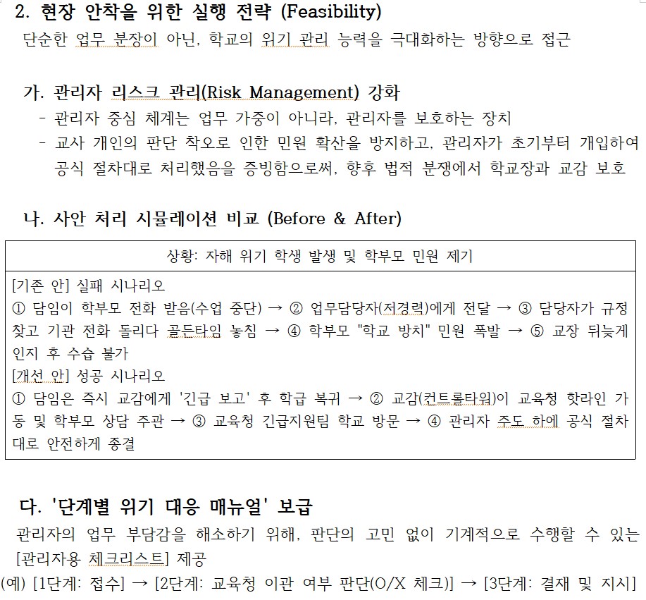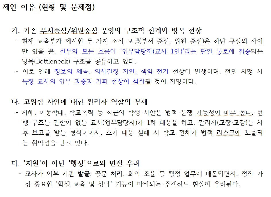학교의 모든 교육활동의 최종 결재권자이며 승인자는 교장이지, 실무자가 아닙니다. 실무자가 처리할 수 있는 기준선을 명확히 제시하고, 책임소재를 분명히 해서, 교사가 정당한 교육활동으로 인한 법적 분쟁에 휘말리지 않도록 해 주세요. 교육부는 현장과 실무자를 생각하는 제도를 만들어 내야하지 않나요?왕보나 2025-12-01