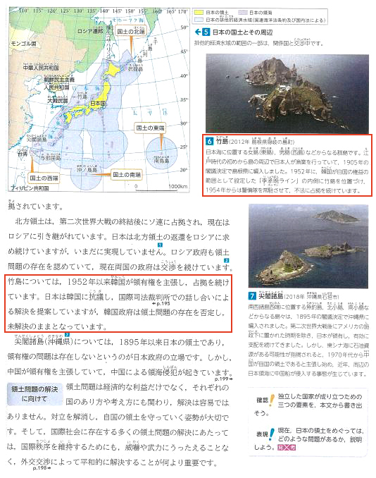 일본해에 있는 다케시마는 시마네현 오키노시마정에 속한 일본고유의 영토다. 1905년에 메이지 정부가 다케시마의 귀속을 내외에 선언하고 국제법에 따라 시마네현에 편입했다. 그러나 한국은 1952년에 해양에 대한 권리를 주장하며 일방적으로 공해상에 경계선을 그어 다케시마를 불법으로 점거하고 있다. 일본은 국제사법재판소에 공동으로 제소할 것을 여러 번 한국에 제안했지만 한국은 해양경찰대를 주둔시키는 등 불법 점거를 지속하고 있다.