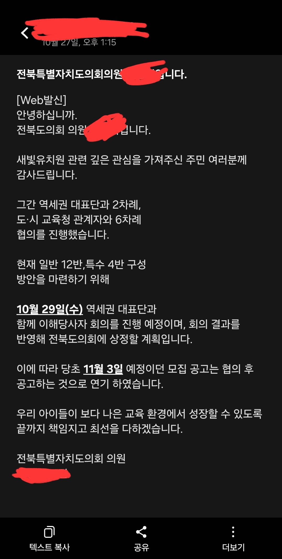 11월 3일 유치원 접수 시작 전에 아이들의 교육권을 보장할 수 있는 당초 계획(일반 12학급, 특수 3학급)으로 학급 운영 계획을 최종 확정하고 공지할 것을 강력히 촉구합니다.